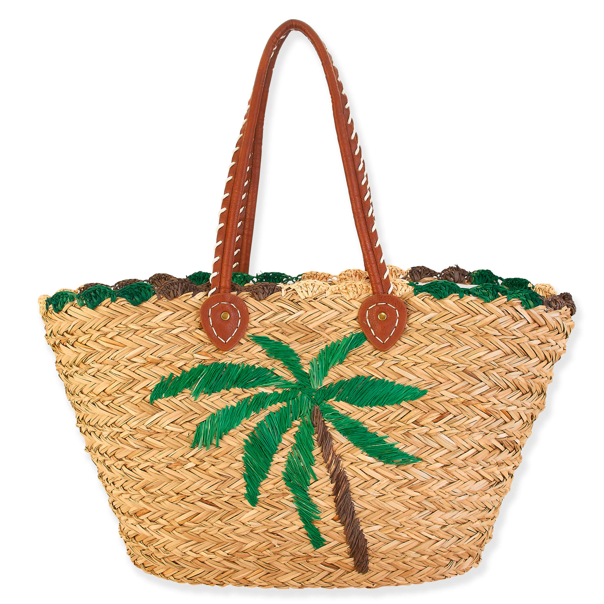 This large natural straw shoulder tote is a fashionable and functional bag that will brighten up your day with its energetic imagery. Constructed with a sturdy build, this bag is designed with a protective fabric inner lining and a zipper closure for security. The comfortable laced PU strap makes it easy to carry while storing all your beach belongings. After a long day out, the bag is perfect for storing all your possessions in one place, eliminating the need to make multiple trips to the car. This bag is perfect for a day at the beach, a picnic in the park, or a shopping trip to the mall. With its fashionable design, sturdy construction, and secure closure, this bag will make your day out much more enjoyable.