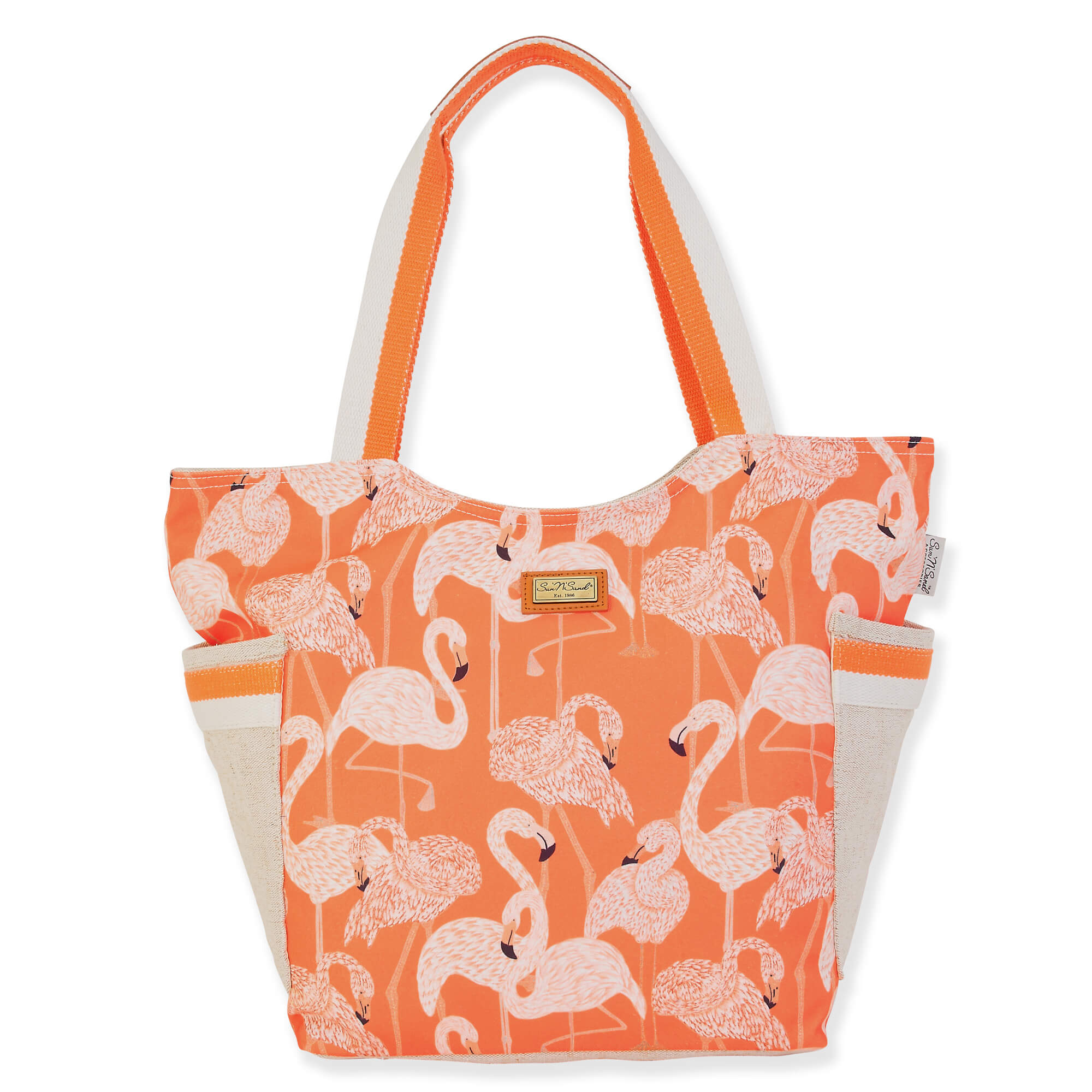 The artistic scoop tote is a must-have for any fashion-forward individual. This stunning tote is printed with a vibrant flamingo pattern, adding a touch of whimsy and charm to any outfit. The two toned handles with leather grips not only add a touch of elegance, but also make it comfortable to carry. The large size pocket storage is perfect for keeping all your essentials organized and easily accessible. Need a secure place to store your phone or keys, the smaller back pocket with a zipper enclosure has your back. This tote is not only stylish, but also highly functional. The large storage compartment is perfect for carrying your laptop, books, or even a change of clothes. No need to worry about losing your smaller items in the bottom of the tote, as the interior storage pockets help keep everything in place, for added security, the tote has a zipper enclosure, ensuring that your belongings stay safe and secure while on the go. Made with durable canvas construction, this tote is perfect for everyday use and will withstand the test of time. Whether you're heading to work, running errands, or going on a weekend getaway, the artistic scoop tote is the perfect accessory to elevate your style and make a statement.